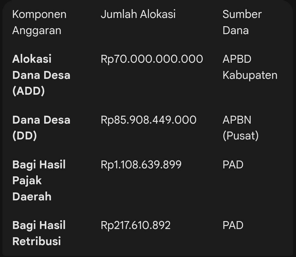Meski Dana Desa (DD) dari pusat menurun, pemerintah daerah tetap mengalokasikan dana pendamping melalui APBD dan bagi hasil pajak. Berikut adalah struktur anggaran desa Kolaka Utara tahun 2026 secara keseluruhan: