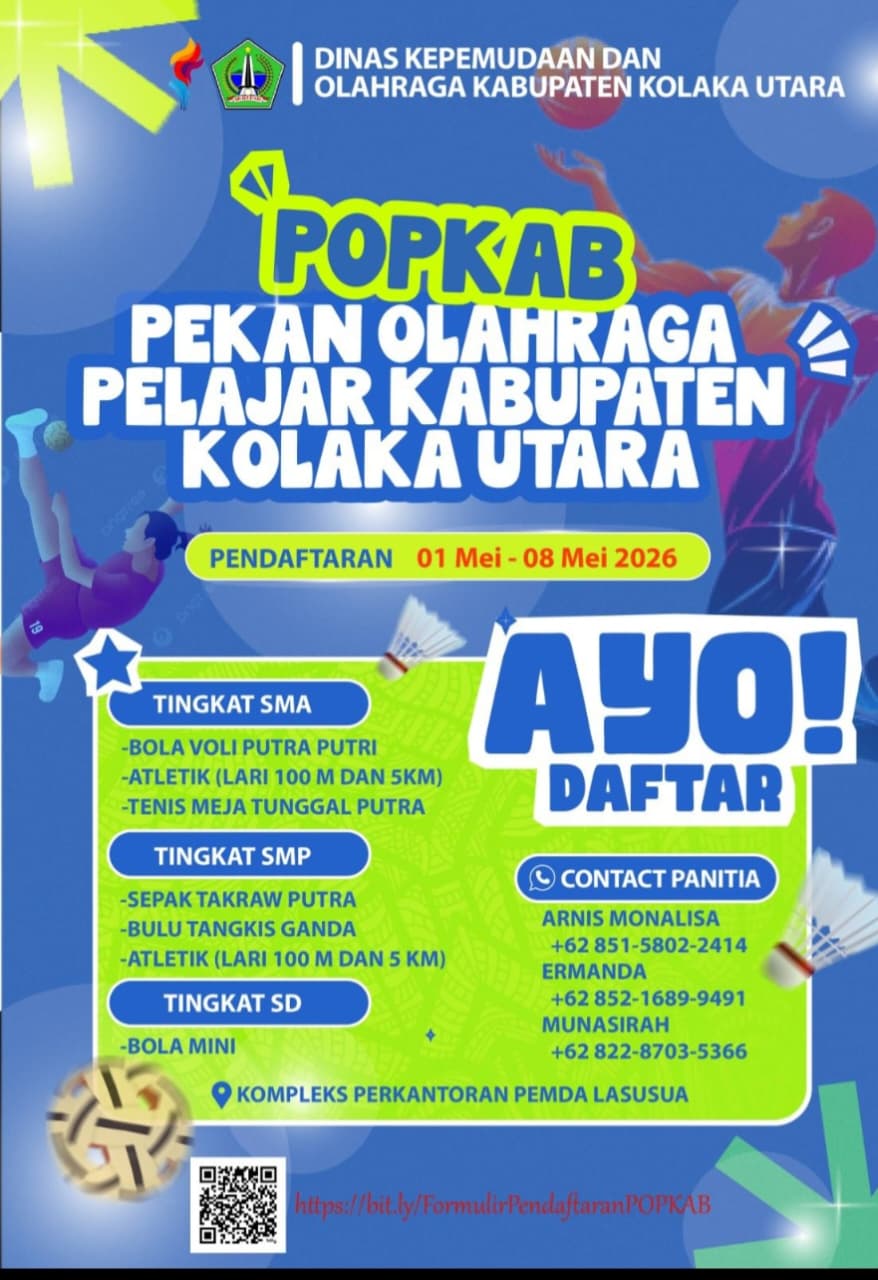 Dinas Kepemudaan dan Olahraga (Dispora) Kabupaten Kolaka Utara resmi mengumumkan penyelenggaraan Pekan Olahraga Pelajar Kabupaten (POPKAB) tahun 2026. Ajang bergengsi tingkat pelajar ini diharapkan menjadi wadah bagi siswa-siswi mulai dari jenjang SD hingga SMA untuk menunjukkan bakat dan sportivitas mereka di bidang olahraga.